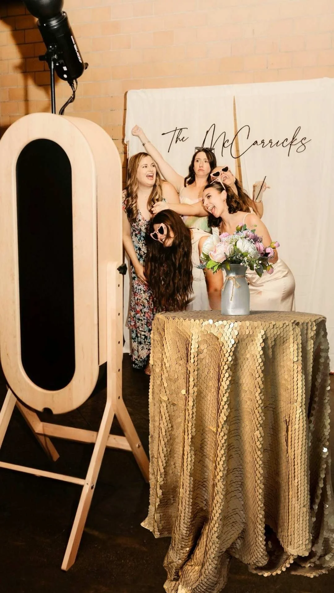 A bride in a wedding dress holding a bouquet raises her arm while standing on a platform with lighting equipment; a group of five friends in formal attire pose and laugh in a photo booth.
